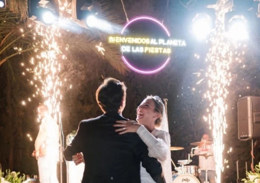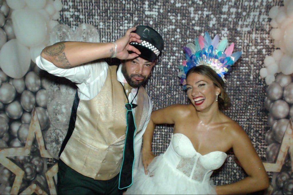 Invitados disfrutando y posando en una boda con animación y efectos de luz Wild Music